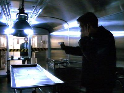 Soldaten kreisen auf dem Gelände der Leprakolonie "Hansen's Disease Research Facility"seltsam aussehende, humanoide Kreaturen ein. Eines der Geschöpfe, dessen Haut gräßlich entstellt ist, beobachtet aus der Ferne, wie die anderen vor einem Massengrab niedergemäht werden. In Scullys Wohnung: Die Agentin fragt Mr. X wütend, wie sie ihm helfen kann. Sie zieht ihre Pistole, wird jedoch entwaffnet. "Ich sage Ihnen nur, daß auch mein Wissen sehr begrenzt ist", sagt er und fügt hinzu, wenn sie mehr über den Zug und darüber wissen will, wer ihre Schwester ermordet hat, soll sie herausfinden, "was in Ihrem Nacken gewesen ist. Dieses Gerät enthält mehr, als ich Ihnen erzählen könnte - vielleicht sogar alles, was Sie wissen müssen." Mulder ist inzwischen in den Zug eingedrungen. Ein Schaffner bringt ihn zum Abteil des japanischen Wissenschaftlers Dr. Zama, das er jedoch leer vorfindet. Inzwischen kehrt Scully zu Agent Pendrell zurück, der ihr berichtet, daß der aus ihrem Hals herausoperierte Chip offenbar die Erinnerungsfunktion des Gehirns kopiert und Denkprozesse dupliziert. "So könnte man Gedanken lesen", überlegt sie. Wie sie vermutet, stammt der Chip aus japanischer Produktion. Im Zug wird Dr. Zama von dem rothaarigen Mann gejagt, der den japanischen Diplomaten ermordet hat. Später findet Mulder den Wissenschaftler tot auf. Scully fährt zu der Seuchenforschungsanstalt, wo sie einigen der entstellten Gestalten begegnet. Es handelt sich um Leprakranke. "Tun Sie uns nichts", bittet ihr Anführer. Er berichtet Scully, daß nach dem Verschwinden des medizinischen Personals Todesschwadronen eingetroffen sind, die Hunderte von ihnen getötet haben. Als der Anführer Scully ein Massengrab zeigt, tauchen ein Hubschrauber und Soldaten auf, die Scully gefangennehmen. Mulder kehrt zu dem Quarantänewaggon zurück, späht durch ein Loch und sieht in der Dunkelheit eine fremdartig aussehende Gestalt. Plötzlich legt der rothaarige Mann Mulder eine Garotte um den Hals und stranguliert ihn. Der Schaffner geht mit einer ungeladenen Waffe dazwischen, die Mulder ihm vorher gegeben hat. Er schließt den Agenten und den rothaarigen Mann in dem Waggon ein. Mulder nutzt diesen Moment, um sich zu erholen und seine Pistole zu ziehen. Der rothaarige Mann behauptet, ein Agent der NSA (National Security Agency) zu sein. Er erzählt Mulder, daß der Waggon eine Zeitbombe enthält. Scully wird von einem älteren Mann empfangen, der bereits in früheren Episoden zu sehen war und offenbar zur "Führungsgruppe" gehört. Er erklärt ihr, die Kreaturen seien "Opfer eines unmenschlichen Projektes". Er meint, die Welt werde nun von denen beherrscht, die die besten Wissenschaftler haben. Im Zug: Das Handy des rothaarigen Mannes piept. Zu seiner Überraschung verlangt die Anruferin Mulder - es ist Scully. "Was immer in diesem Waggon sitzt, ist kein Außerirdischer", sagt sie ihm. Zama habe in einer Lepra-Kolonie an menschlichen Versuchspersonen experimentiert. Die geheime Eisenbahnstrecke wurde für diese Tests verwendet, und die Autopsie an einem außerirdischen sei "nur eine Finte". Die Testperson in ihrem Zug habe eine ansteckende Krankheit, an der Tausende sterben werden, wenn die Bombe explodiert. Mulder ist skeptisch, findet jedoch die Bombe, deren Zeitzünder noch etwas mehr als hundert Minuten bis zur Detonation anzeigt. Er weist den Schaffner an, sie so weit wie möglich von besiedelten Gebieten umzuleiten. Dort koppeln sie den Waggon ab, der mit Mulder und dem rothaarigen Mann an Bord langsam ausrollt. Während die Minuten verstreichen, meint der rothaarige Mann, ihre Fracht sei "eine Waffe". Mulder vermutet, daß Zama eine Methode zur Immunisierung gegen biologische Waffen fand. Seiner Ansicht nach wollte die Regierung verhindern, daß diese Experimente an die Öffentlichkeit gelangen. Die Kreatur in dem Quarantänewaggon hält er für einen Hybriden. Scully versucht, Senator Matheson zu erreichen und Mr. X zu Hilfe zu rufen. Sechs Minuten, bevor die Bombe detonieren wird, nimmt sie noch einmal Kontakt mit Mulder auf. Sie hat sich anhand des Videos den ausgangs-Code des Wagens verschafft, den Mulder nun eingibt. Während die Tür aufgeht, schlägt der Rothaarige Mann Mulder bewußtlos. Doch als er aus dem Waggon springt, wird er von einem Schuß niedergestreckt. Er wurde von Mr. X abgefeuert, der den blutig geschlagenen Mulder auf seiner Schulter in Sicherheit bringt, während der Waggon mitsamt seinem Inhalt explodiert. Als Mulder eine Woche später versucht, mehr über den Waggon zu erfahren, stößt er auf eine Mauer des Schweigens. Selbst Senator Matheson erwidert seine Anrufe nicht. Zudem erweisen sich Dr. Zamas Aufzeichnungen als Fälschung. "Die kommen damit schon wieder durch, Scully", sagt er frustriert. "Die sind schon damit durchgekommen, Mulder", erwidert sie. Wütend meint Mulder, er wolle nicht die üblichen vorformulierten Antworten hören, sondern "eine Entschuldigung für die Wahrheit".![]() |