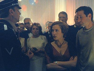 Nachdem er in der Sargasso Meer bei stürmischem Wetter aus seinem Boot geschleudert wird fischen Mulder ein paar feindselige Seemänner aus dem Meer. Als er wieder zu Bewußtsein kommt, stellt er fest, daß er sich an Bord der "Queen Anne", einem englischem Luxusliner, der in den 30er Jahren während des 2. Weltkriegs verschwand, befindet. Als Mulder zum Kapitän Yin Harburgh gebracht wird, versucht er ihm zu erklären, daß der Krieg längst vorbei ist. Mulder vermutet, daß das Schiff die letzen 50 Jahre, im Bermuda Dreieck, in einer Zeitblase gefangen war. Der Kapitän und die Mannschaft glauben ihm jedoch nicht. Zumal das Schiff kurz vorher von Nazis geentert wurde, die glauben das "Thors Hammer" an Bord ist. Diese nehmen an, daß "Thor´s Hammer" eine Atombombe ist. Wie Mulder ihnen aber erklärt, handelt es sich lediglich um ein Wissenschaftler, der an einer Atombombe bauen könnte. Die Nazis hoffen, wenn sie die Atombombentechnologie haben, den Krieg gewinnen zu können. Der Wissenschaftler reist an Bord, mit einer Frau, die genau wie Scully aussieht. Mulder versucht diese Frau, Scullys Ebenbild zu überzeugen, daß sie das Schiff wenden muß, um die Zukunft zu retten. Wenn sie es nicht tue, werden die Deutschen den Krieg gewinnen und Mulder und Scully werden nie existiert haben. Scullys Ebenbild, ist verwirrt, aber Mulder ist davon überzeugt, daß das eine Chance ist, seine eigene Geschichte zu ändern. Er gibt Scully einen langen leidenschaftlichen Kuß, woraufhin sie ihm einen kräftigen Kinnhaken verpasst. Mulder der es sehr eilig hat, in seine eigene Zeit zurückzukehren springt einfach über Bord. Währenddessen, treffen die Lone Gunman im FBI-Hauptquartier ein, um Scully über Mulders Verschwinden zu informieren. Scully bittet Skinner um seine Mithilfe. Dieser besorgt daraufhin, die Satelliten Daten der Navy, um das vermißte Schiff zu finden. Unterwegs zu dem Ort an dem Mulder verschwand finden Scully und die Lone Gunman Mulder. Später im Krankenhaus besuchen sie ihn und er versucht ihnen alles zu erzählen, doch sie halten es für einen Traum. Sie wünschen ihm alle gute Besserung und gehen. Als Mulder kurz darauf alleine in seinem Zimmer ist, bemerkt er eine Druckstelle in seinem Gesicht. Genau an der Stelle, auf die Scullys Ebenbild ihn geschlagen hat und erkennt, daß es doch kein Traum war.![]() |
